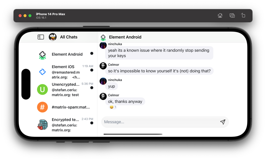 On the app itself, we have spent a lot of time on getting the chat right. The appโ€™s core was upgraded to matrix-sdk 0.6+ to get the latest timeline API in, which required quite some refactoring. But allowed us to implement reactions, edits and replies. Encrypted Messages are still somewhat unreliable though. Prior to the nightly builds weโ€™ve also taken some time to clean up the UI to give it a more polished look and make clear which things are simply not enabled yet. On the non-chat side of things, weโ€™ve mostly worked on UI things (check out the ToDo-Sections and Pins), while we were waiting for the synapse fix on reading the timeline from the beginning, which is now released in 1.73. Happy to get back to implementing the state machines soon.